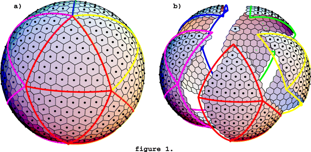 Consider, for example, the geodesic grid with 642 cells as shown in figure 1.a. The spherical geodesic grid can be covered with 20 spherical triangles. The vertices of the triangles are the centers of the pentagons. Suppose the 20 spherical triangles are partitioned into five sets of four triangles. The five sets are denoted with red, yellow, green, blue and magenta. Each of the five sets has the same structure and can be made coincident with any other set through rotation about the axes defined by the north and south pole. Hence, each set has one vertex coincident with both the north and south pole. To better visualize the sets, we can break the grid into five pieces by moving each set of triangles radially outward away from the axes of rotation. This is shown in figure 1.b. The cells associated with a particular color come along for the ride. However, in this figure, the cells at the north and south pole remain fixed in place.