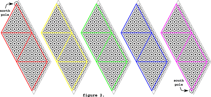 Suppose the pieces in figure 1.b are rolled out and stretched out so that they are flat as shown in figure 2. We have arbitrarily connected the cell at the north pole with the red set and the cell at the south pole with the magenta set. From figure 1.b we can see that the vertices of the spherical triangles are associated with the mid-latitude pentagons. However, the corresponding vertices in figure 2 lie on top of hexagons. This is somewhat deceptive. Even though these cells are depicted as hexagons in figure 2, they are really pentagons. The same thing is true for the cells at the north and south pole.
